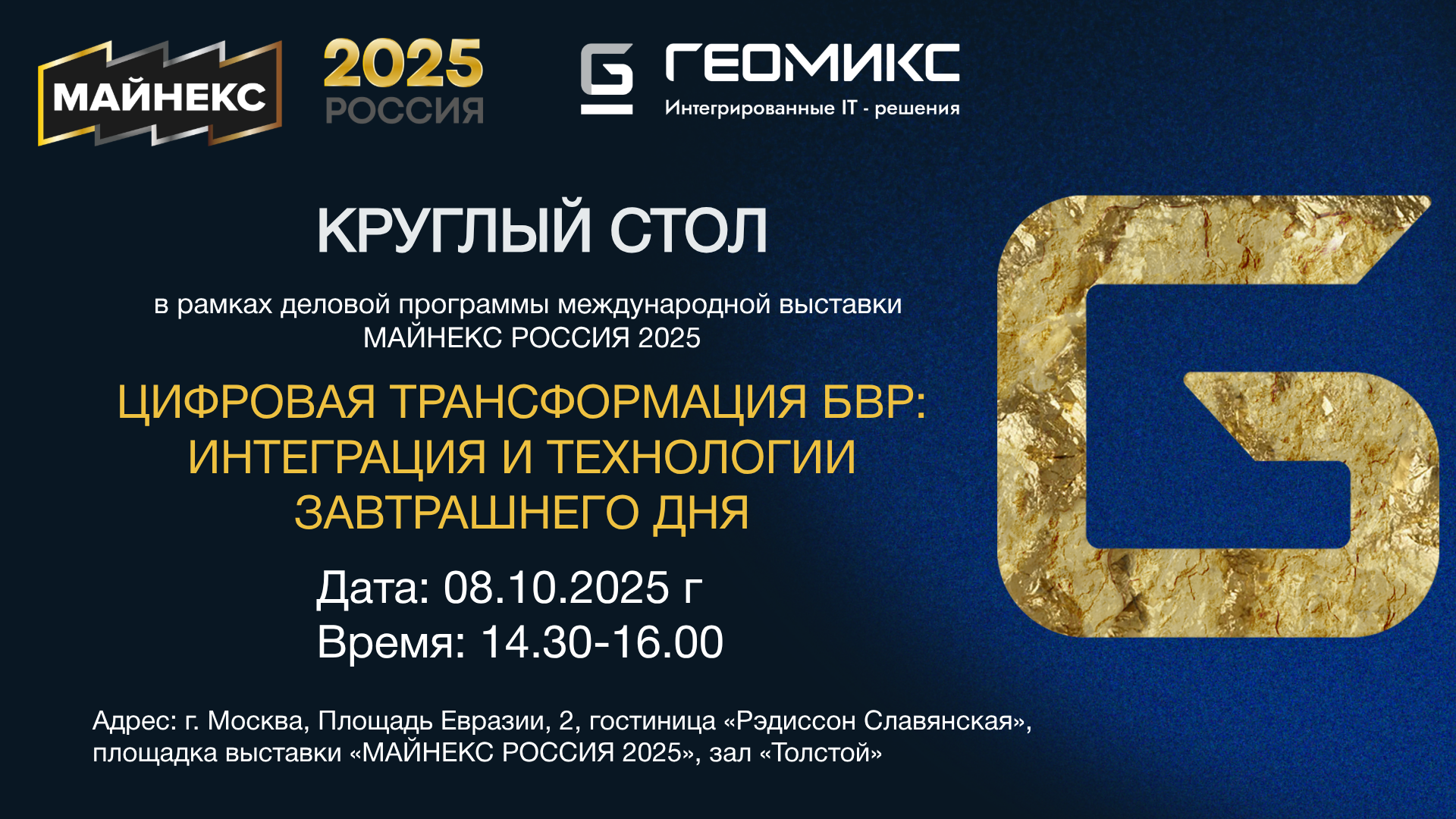 Место: г. Москва, Площадь Евразии, 2, гостиница «Рэдиссон Славянская», площадка выставки «МАЙНЕКС РОССИЯ 2025»,
